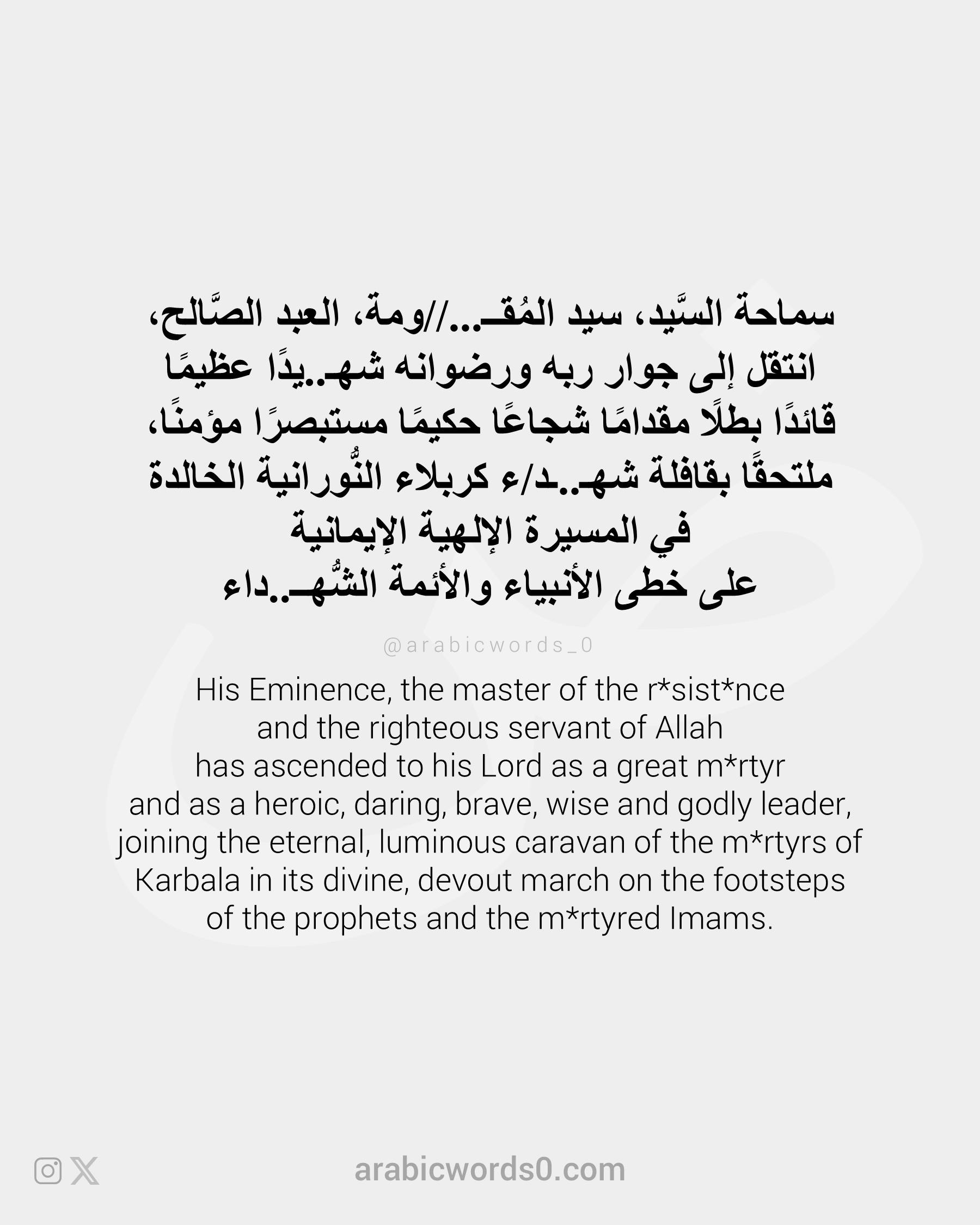 سماحة السَّيد، سيد المُقــ...//ومة، العبد الصَّالح، انتقل إلى جوار ربه ورضوانه شهـ..يدًا عظيمًا قائدًا بطلًا مقدامًا شجاعًا حكيمًا مستبصرًا مؤمنًا، ملتحقًا بقافلة شهـ..ـد/ء كربلاء النُّورانية [...]