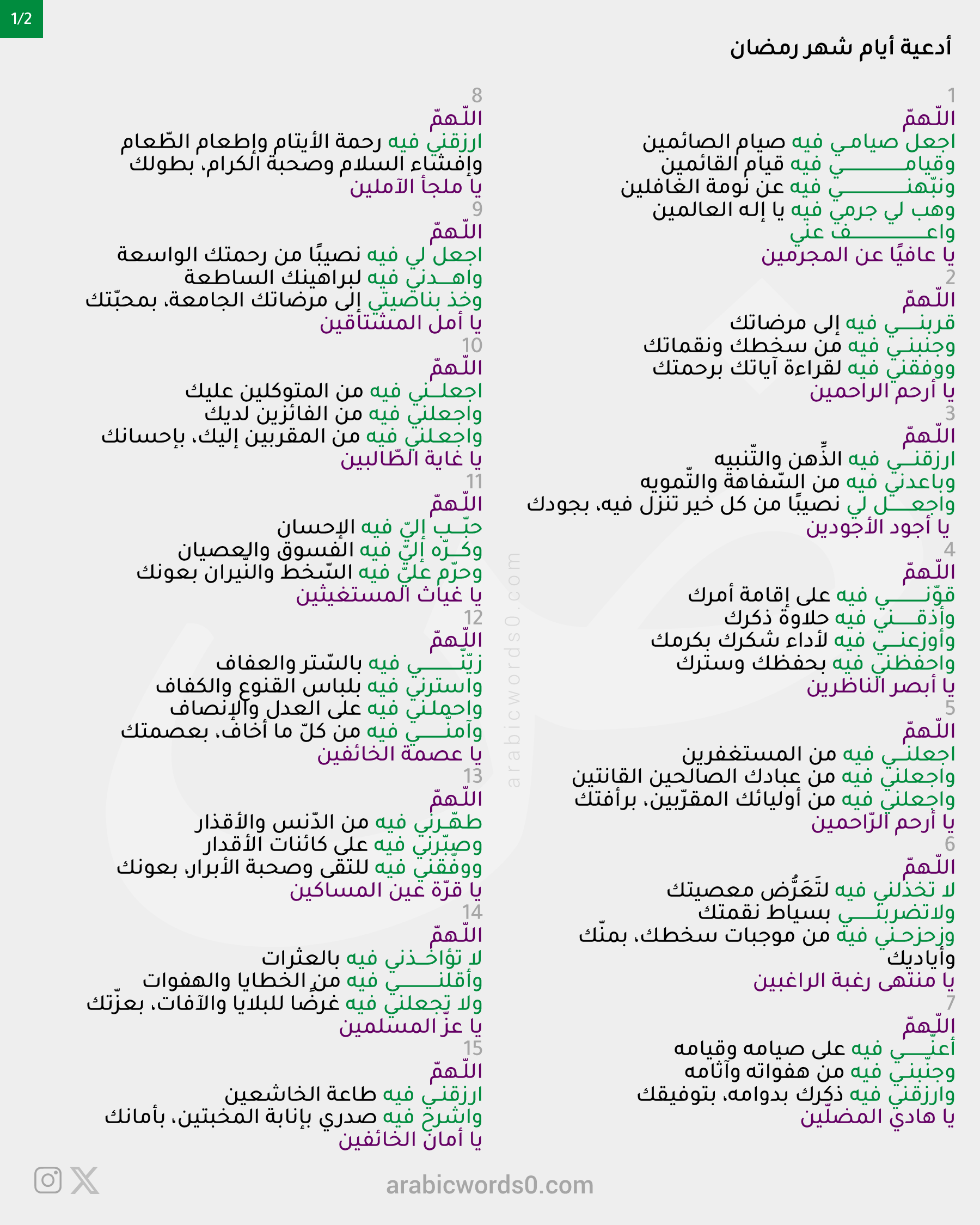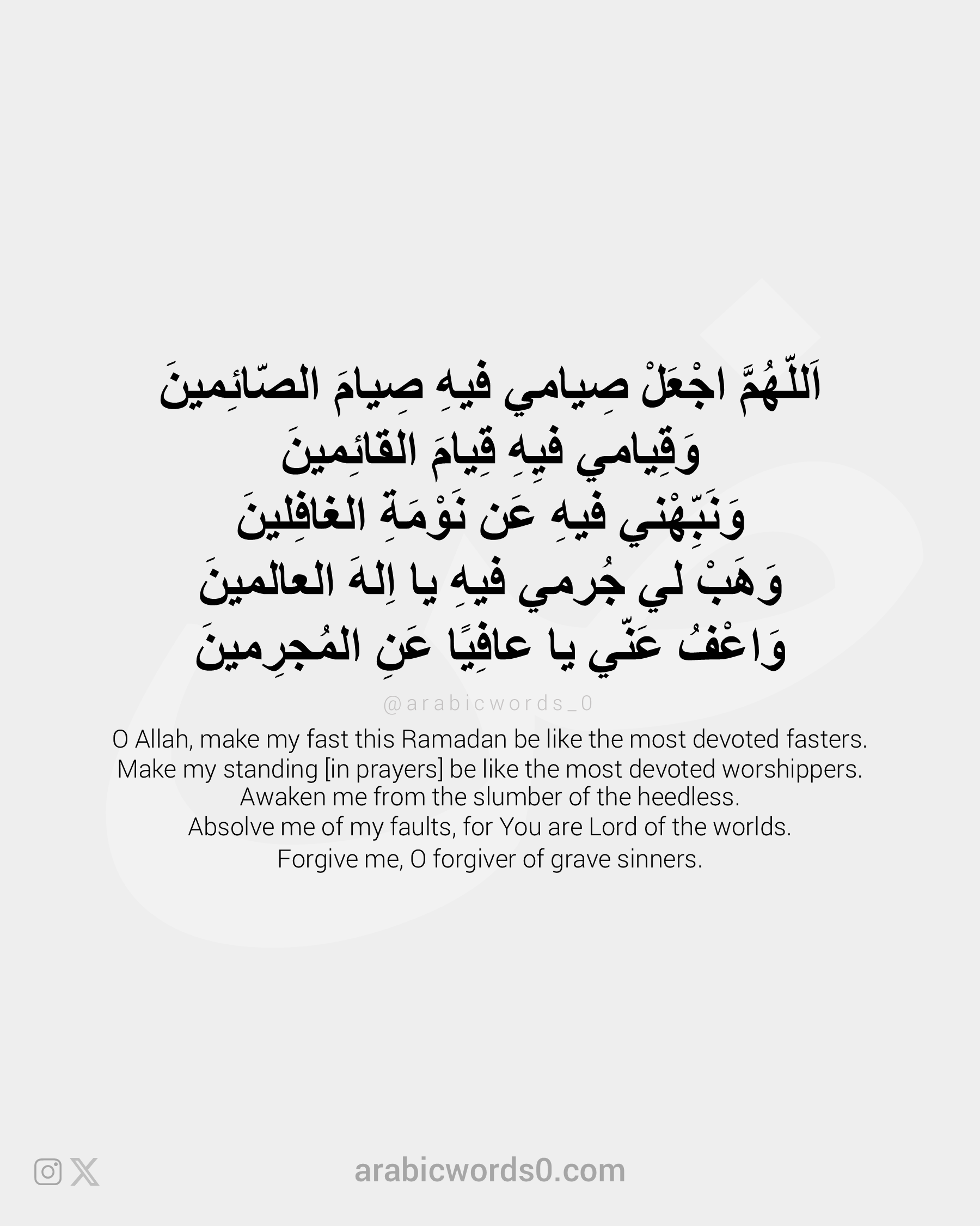 اَللّهُمَّ اجْعَلْ صِيامي فيهِ صِيامَ الصّائِمينَ وَقِيامي فيِهِ قِيامَ القائِمينَ وَنَبِّهْني فيهِ عَن نَوْمَةِ الغافِلينَ وَهَبْ لي جُرمي فيهِ يا اِلهَ العالمينَ وَاعْفُ عَنّي يا عافِيًا عَنِ [...]