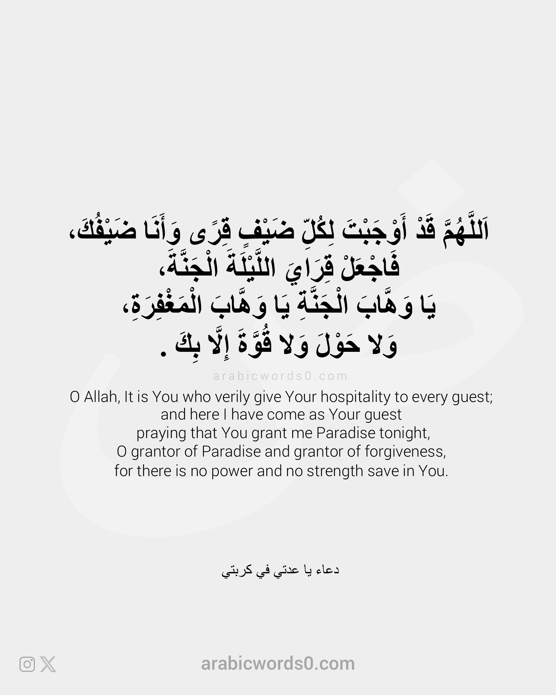 اَللَّهُمَّ قَدْ أَوْجَبْتَ لِكُلِّ ضَيْفٍ قِرًى وَأَنَا ضَيْفُكَ، فَاجْعَلْ قِرَايَ اللَّيْلَةَ الْجَنَّةَ، يَا وَهَّابَ الْجَنَّةِ يَا وَهَّابَ الْمَغْفِرَةِ، وَلا حَوْلَ وَلا قُوَّةَ إِلَّا [...]