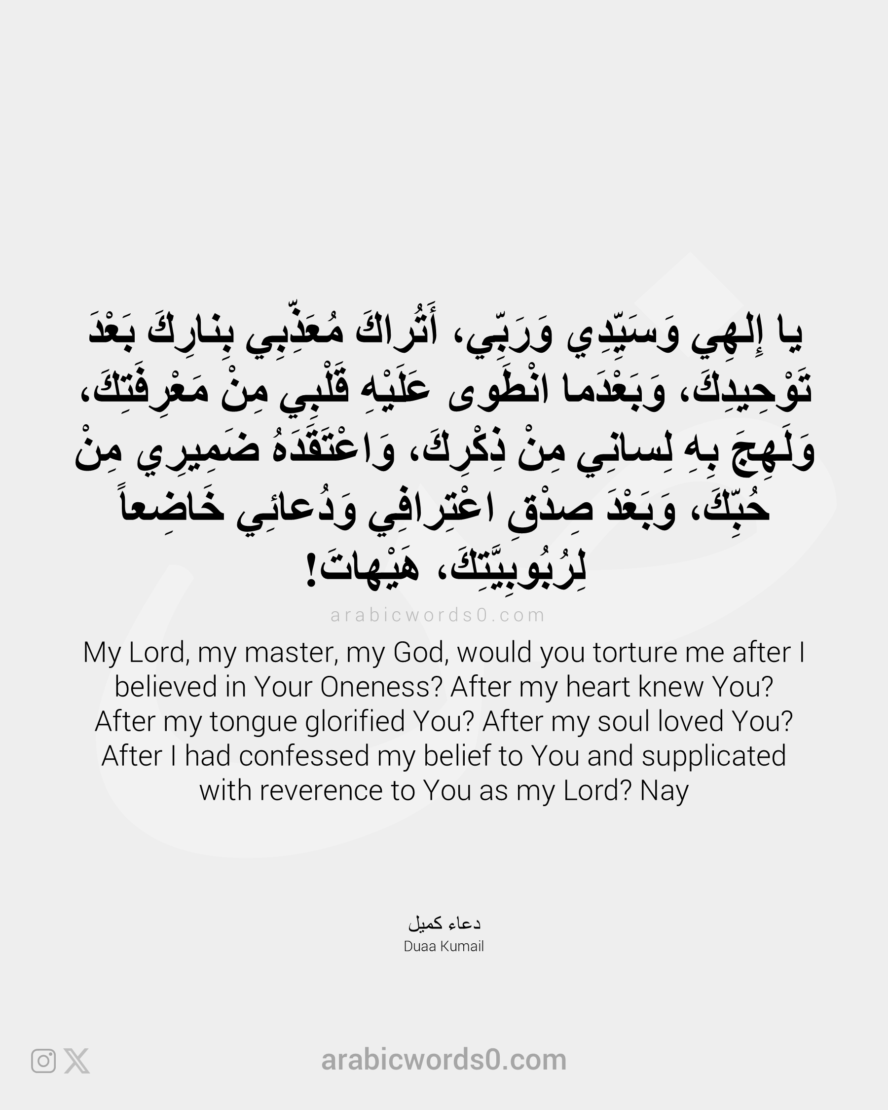يا إِلهِي وَسَيِّدِي وَرَبِّي، أَتُراكَ مُعَذِّبِي بِنارِكَ بَعْدَ تَوْحِيدِكَ، وَبَعْدَما انْطَوى عَلَيْهِ قَلْبِي مِنْ مَعْرِفَتِكَ، وَلَهِجَ بِهِ لِسانِي مِنْ ذِكْرِكَ، وَاعْتَقَدَهُ ضَمِيرِي مِنْ [...]
