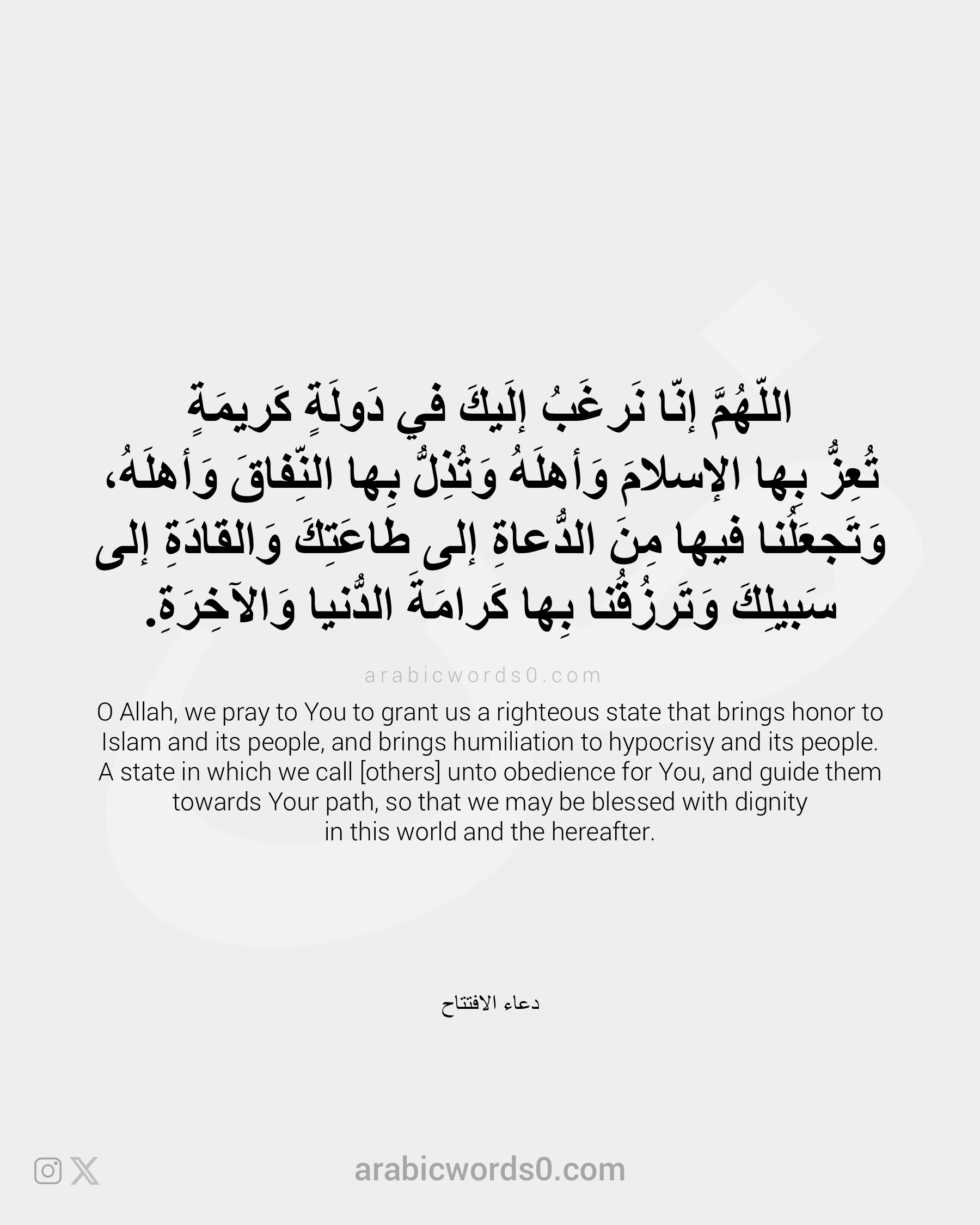 اللّهُمَّ إنّا نَرغَبُ إلَيكَ في دَولَةٍ كَريمَةٍ تُعِزُّ بِها الإسلامَ وَأهلَهُ وَتُذِلُّ بِها النِّفاقَ وَأهلَهُ، وَتَجعَلُنا فيها مِنَ الدُّعاةِ إلى طاعَتِكَ وَالقادَةِ إلى سَبيلِكَ وَتَرزُقُنا [...]