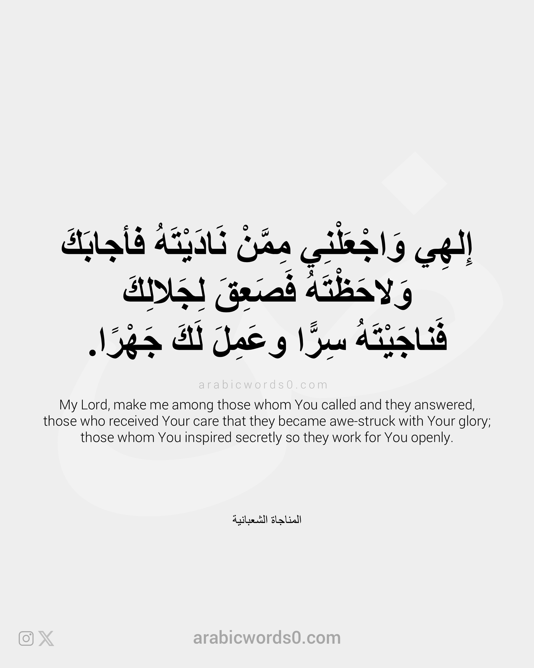 إِلهِي وَاجْعَلْنِي مِمَّنْ نَادَيْتَهُ فأجابَكَ وَلاحَظْتَهُ فَصَعِقَ لِجَلالِكَ فَناجَيْتَهُ سِرًّا وعَمِلَ لَكَ جَهْرًا.