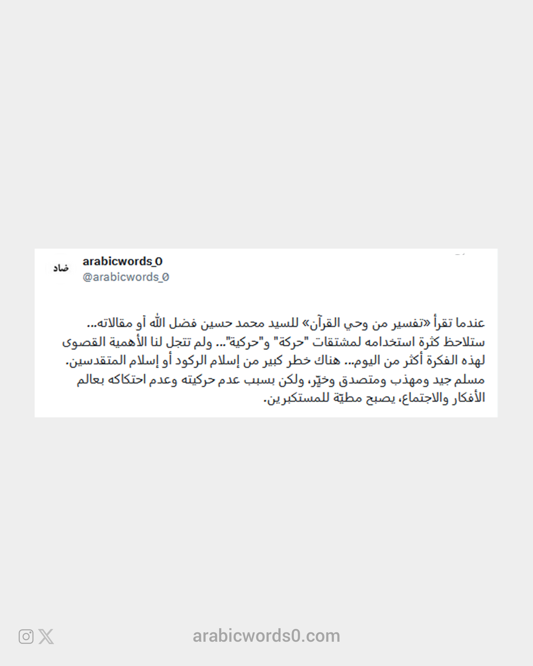 تغريدة: عندما تقرأ «تفسير من وحي القرآن» للسيد محمد حسين فضل الله أو مقالاته... ستلاحظ كثرة استخدامه لمشتقات "حركة" و"حركية"... ولم تتجل لنا الأهمية القصوى لهذه الفكرة أكثر من اليوم... هناك خطر كبير [...]