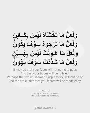 ولَعَلَّ مَا تَخْشَاهُ لَيْسَ بِكَائِنٍ ولَعَلَّ مَا تَرْجُوهُ سَوْفَ يَكُونُ